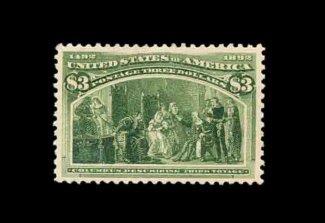 394 og 243a image#243a, $3.00 Columbian, the olive green shade, a highly desirable mint single, being exceedingly well centered within extravagantly large margins, deeply rich color and a crisp impression, o.g., lightly hinged, extremely fine; 2001 PF certificate. (Image) 2,100.00
