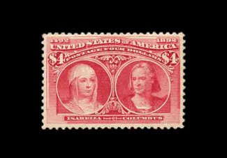 397 og 244 image#244, $4.00 Columbian, uncommonly rich color and a crisp detailed impression, very well centered and margined, o.g., lightly hinged, choice very fine; 1999 PF and PSE certificates. (Image) 2,900.00
