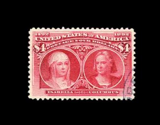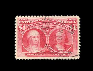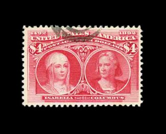 400 O 244 image#244, $4.00 Columbian, used, lovely rich color, well centered, unusually light and unobtrusive target cancel at top, a fresh and very fine used example; 2002 PF certificate. (Image) 1,350.00