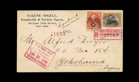 482 c 299 image#299, 10c Pan American, on 1902 registered cover to Yokohama, Japan, along with 3c Vermilion (#214; natural straight edge with partial arrow), both tied by New York ovals, neat red "Registered./May 16 1902/Branch P.O. Station O/New York, P.O." boxed handstamp on both front and back, San Francisco registry label slightly overlaps the 3c, backstamped by Yokohama single circle foreign mail cancel with inverted date, a very fine inbound cover to Japan at the turn of the century. (Image) Est. 200-300
