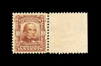 486 nh 307 image#307, 10c Pale red brown, a highly desirable right sheet-margin mint single, being marvelously well centered amid lavishly large margins, deep luxuriant color and a razor-sharp impression, immaculate o.g., n.h., extremely fine; a particularly handsome gem; 2002 PF certificate. (Image) 135.00