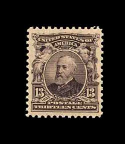 488 nh 308 image#308, 13c Purple black, wonderfully well centered within very large margins (especially at top and bottom), strong rich color and a sharp detailed impression, immaculate o.g., n.h., extremely fine gem; 2002 PF certificate for a block of four, this being the bottom left stamp. (Image) 95.00