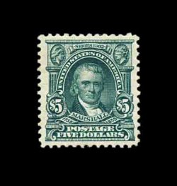 498 og 313 image#313, $5.00 Dark green, a most impressive mint example of this very scarce high value, possessing outstanding centering that is far superior to the vast majority, with large margins all around (a seldom seen occurence on this stamp), sumptuously rich color and a crisp impression, o.g., lightly hinged, extremely fine; an especially desirable stamp in this gem quality; 2000 PF certificate. (Image) 3,000.00