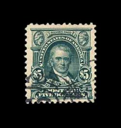 501 O 313 image#313, $5.00 Dark green, an extraordinarily choice used single, being in a quality that would be quite a challenge to duplicate, possessing lavishly large margins all around and being remarkably well centered within these oversized borders, rich luxuriant color and impression, face-free cancel, extremely fine; a stamp for the collector who appreciates the true rarity of this stamp in premium used condition; 2001 PF certificate. (Image) 750.00