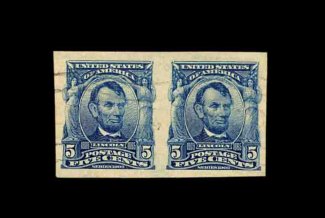 503 O 315 image#315, 5c Blue imperforate, a very rare used horizontal pair, with uncharacteristically large margins all around, strong rich color and a crisp impression, light wavy machine cancel, extremely fine; used pairs are quite undercataloged and greatly sought-after, as similar quality pairs have been realizing $3,500.00-$4,500.00 recently at auction. (Image) 2,500.00