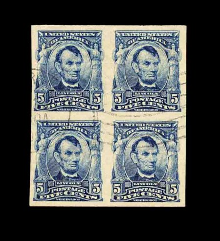 504 Obl 315 #315, 5c Blue imperforate, a highly desirable used block of four, all used examples of this imperforate are scarcer than their mint counterparts, but blocks of four are particularly elusive, even the Gold Medal collection of Roger Brody that specialized in these issues lacked a used block, having only a single and a pair, this example is particularly choice with a neat machine flag cancel across the center of the block rather than oval cancels that are often found, margins are large to extra large, deep color and unusually sharp impression, extremely fine; an outstanding twentieth century used rarity. (Image) 5,250.00
