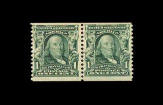 505 og 318 image#318, 1c Blue green coil, perf. 12 vert., an exceptional quality mint pair of this coil rarity, possessing outstanding centering which is seldom encountered on this typically poorly centered coil, rich color characteristic only to genuine examples of this, crisp impression on clean fresh paper, even its perforations between the stamps are unusually strong and intact, full clean o.g., lightly hinged, extremely fine; certainly among the finest of the less than 100 pairs thought to still exist; each stamp with light MeKeel guarantee handstamp and accompanied by 1954 and 2002 PF certificates. (Image) 14,000.00