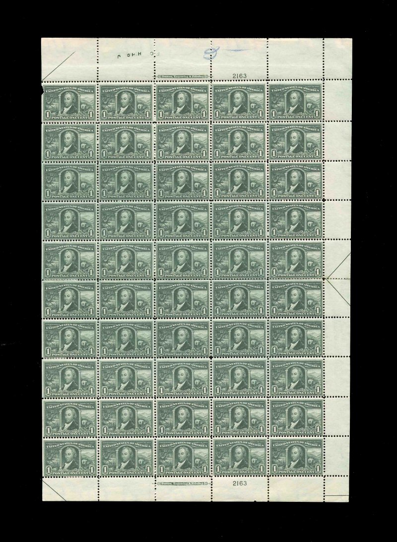 506 og/nhbl 323 #323, 1c Louisiana Purchase, right plate no. 2163 pane of 50, with plate blocks at top and bottom including a full top, deep color, o.g., hinged in bottom selvage and five stamp in left column affected by hinge reinforced perfs., position 49 with tear, some minor perf. separations, top left stamp defective, light crayon mark in top selvage, fine-very fine appearance. (Image) 2,762.00+