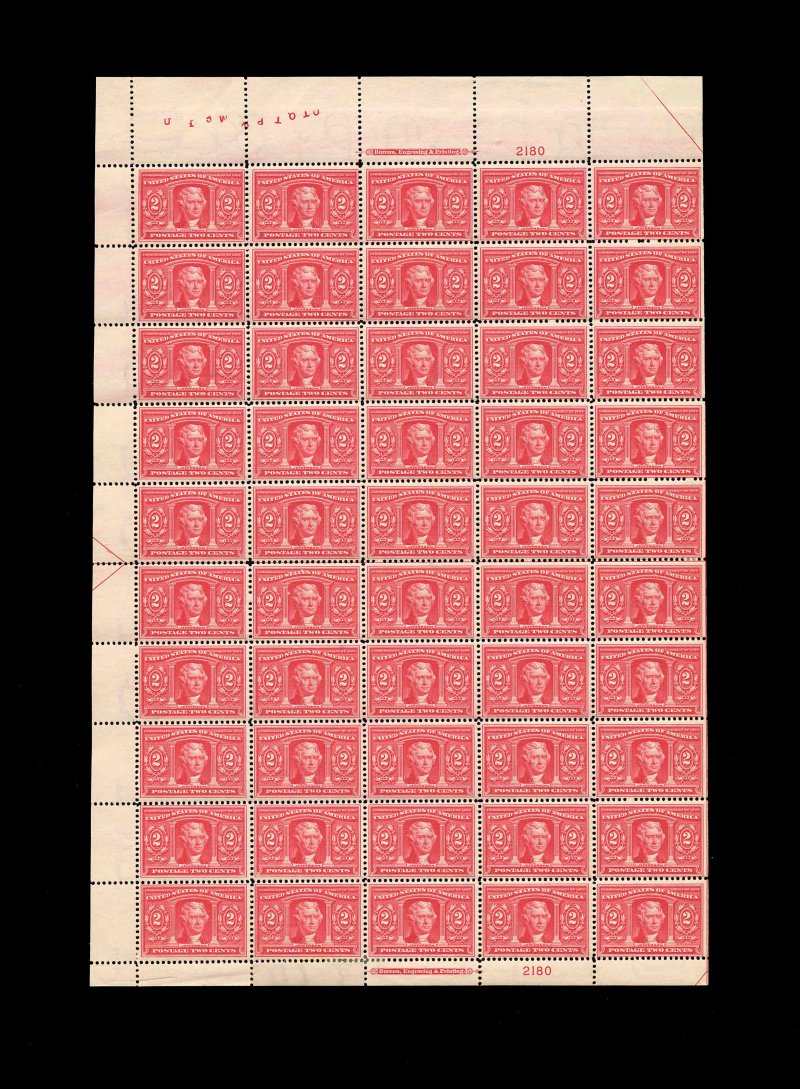 507 og/nhbl 324 #324, 2c Louisiana Purchase, left plate no. 2180 pane of 50, with plate block at top and bottom including a full top, strong color, o.g., n.h. except two stamp at right and two stamps in bottom row with small hinge reinforcements, small selvage tear below bottom left stamp, fine-very fine. (Image) 2,660.00+
