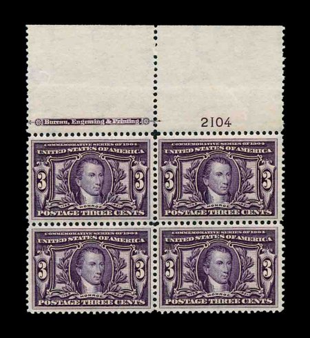 509 ogPB 325 #325, 3c Louisiana Purchase, choice full top imprint and plate no. 2104 block of four, with a huge sheet margin at top, outstanding centering, rich luxuriant color, o.g., barest trace of hinging, extremely fine; a handsome plate block; 2002 PF certificate. (Image) 625.00