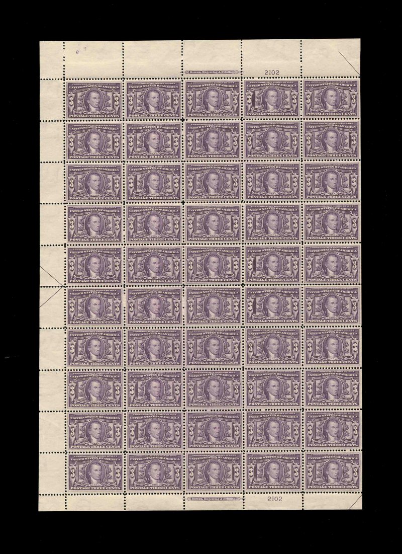 510 nhbl 325 #325, 3c Louisiana Purchase, an incredibly choice left plate no. 2102 pane of 50, with plate blocks at top and bottom including a full top, being exceptionally fresh and crisp, with strong rich color, many well centered stamps, clean fresh o.g., never hinged, choice very fine; certainly one of the finest (if not the finest) of the few full panes available. (Image) 9,460.00+
