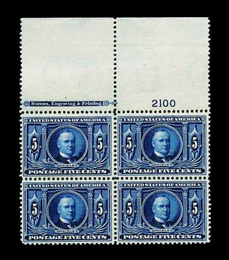 512 ogPB 326 #326, 5c Louisiana Purchase, full top margin imprint and plate no. 2100 block of four, with huge sheet selvage, brilliantly fresh and crisp, with prooflike color and impression, quite well centered, o.g., bottom right stamp n.h., others very lightly hinged, very fine; 2002 PF certificate. (Image) 675.00