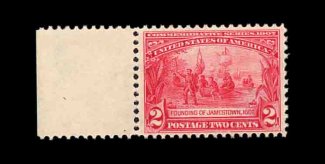 514 nh 329 image#329, 2c Jamestown, gem left sheet-margin mint single, with especially intense color and a prooflike impression, marvelously well centered within extraordinarily wide margins which are rarely seen on this narrowly-spaced stamp, pristine o.g., n.h., extremely fine; 2002 PF certificate for a block of four, this being the bottom left stamp. (Image) 67.50