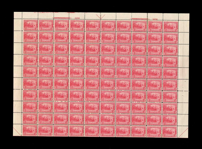 515 og/nhbl 329 #329, 2c Jamestown, top plate no. 3656 pane of 100, fresh color, most with typical fine centering although some well centered stamps will also be found, o.g., all but six stamps n.h. (hinging affects one plate block), some perf. strengthening/reinforcing, particularly between the eighth and ninth columns, fine-very fine. (Image) 6,760.00+