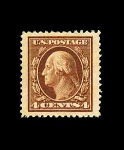 565 og 377 image#377, 4c Brown, a spectacular mint single, featuring gigantic margins and being remarkably well centered within these colossal borders, deep intense color, o.g., faintly hinged, an extremely fine jumbo. (Image) 32.50