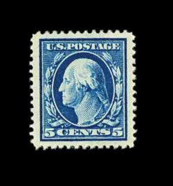 566 nh 378 image#378, 5c Blue, a phenomenal jumbo mint single, precisely placed within equal huge margins on all four sides, a choice stamp in every respect with dark intense color and sharp impression, pristine o.g., n.h., simply superb; 1996 PF certificate for a block of four, this being the top left stamp. (Image) 60.00