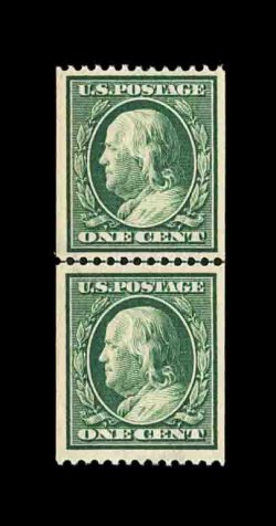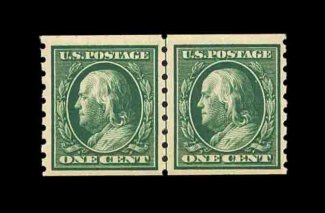 571 og/nh 387 image#387, 1c Green coil, perf. 12 vert., pair, 3mm spacing, exceptionally fresh, deep rich color, well centered within large margins, o.g., left stamp lightly hinged, right stamp n.h., very fine and choice; 1986 PF certificate. (Image) as singles 575.00