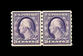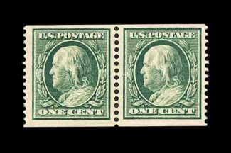 570 nh 385 image#385, 1c Green coil, perf. 12 horiz., a remarkably fresh and choice guide line pair, possessing rich luxuriant color and a razor-sharp impression on clean white paper, additionally it is wonderfully well centered within uncharacteristically large margins, immaculate o.g. without a single bend or skip, n.h., extremely fine; any certified #385 line pair is scarce, but to find one in this impressive quality is truly rare; 1996 PF certificate. (Image) 950.00