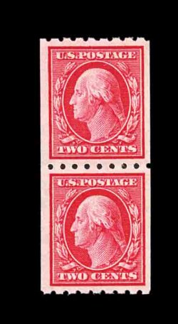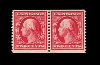 575 nh 391 image#391, 2c Carmine coil, perf. 8 1/2 horiz., pair, well centered within extraordinarily large margins, deep luxuriant color, pristine o.g., n.h., extremely fine; 1983 PF certificate. (Image) 220.00