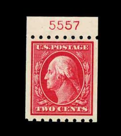 574 nh 391 image#391, 2c Carmine coil, perf. 8 1/2 horiz., top margin plate no. 5557 single, well centered within extra-large margins, radiant rich color and a vivid impression, o.g., n.h., extremely fine; plate number singles are rarely encountered, especially in this premium quality; 1993 PF certificate for a paste-up pair, this being the bottom stamp. (Image) 75.00+