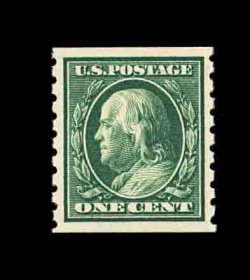 576 nh 392 image#392, 1c Green coil, perf. 8 1/2 vert., select mint single, excellent centering within very large margins, strong rich color on fresh white paper, o.g., n.h., extremely fine; 1996 PF certificate. (Image) 47.50