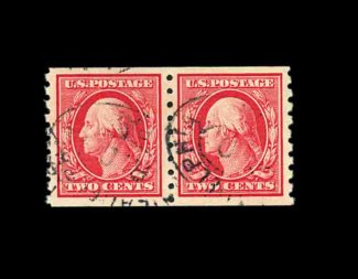579 O 393 image#393, 2c Carmine coil, perf. 8 1/2 vert., used pair, exceedingly well centered within large margins, bright color, light oval postmarks, extremely fine; used pairs are greatly undercataloged, especially in this premium condition; 1994 PF certificate. (Image) 55.00