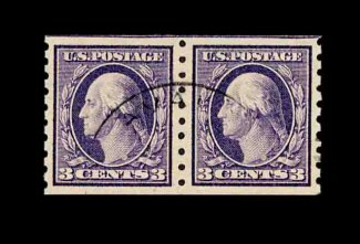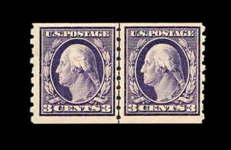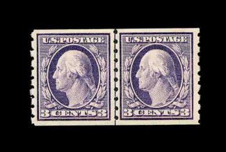 581 nh 394 image#394, 3c Deep violet coil, perf. 8 1/2 vert., premium quality guide line pair, excellent centering, strong rich color on fresh white paper, o.g., n.h., an extremely fine example of this scarce line pair; 2002 PF certificate for a strip of four, this being the right pair. (Image) 800.00