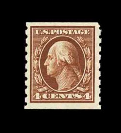 584 nh 395 image#395, 4c Brown coil, perf. 8 1/2 vert., fresh mint single, sumptuously rich color on crisp paper, well centered within uncommonly large margins, o.g., n.h., choice very fine; 1996 PF certificate. (Image) 110.00