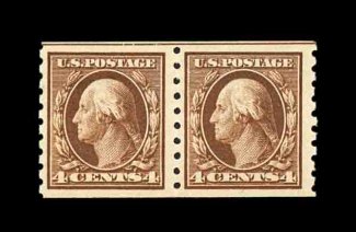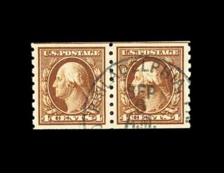 586 O 395 image#395, 4c Brown coil, perf. 8 1/2 vert., used pair with 3mm spacing and with guide line at top, outstanding centering, strong rich color on fresh paper, Philadelphia c.d.s. postmark, extremely fine; gem used pairs such as this are quite elusive; 1992 PF certificate. (Image) 140.00