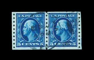 588 O 396 image#396, 5c Blue coil, perf. 8 1/2 vert., very scarce used pair, cut from a strip so that equal portions of adjoining stamps appear at sides, well centered, especially deep luxuriant color, light central strike of a duplex cancel, very fine and quite choice; 2002 PF certificate. (Image) 150.00