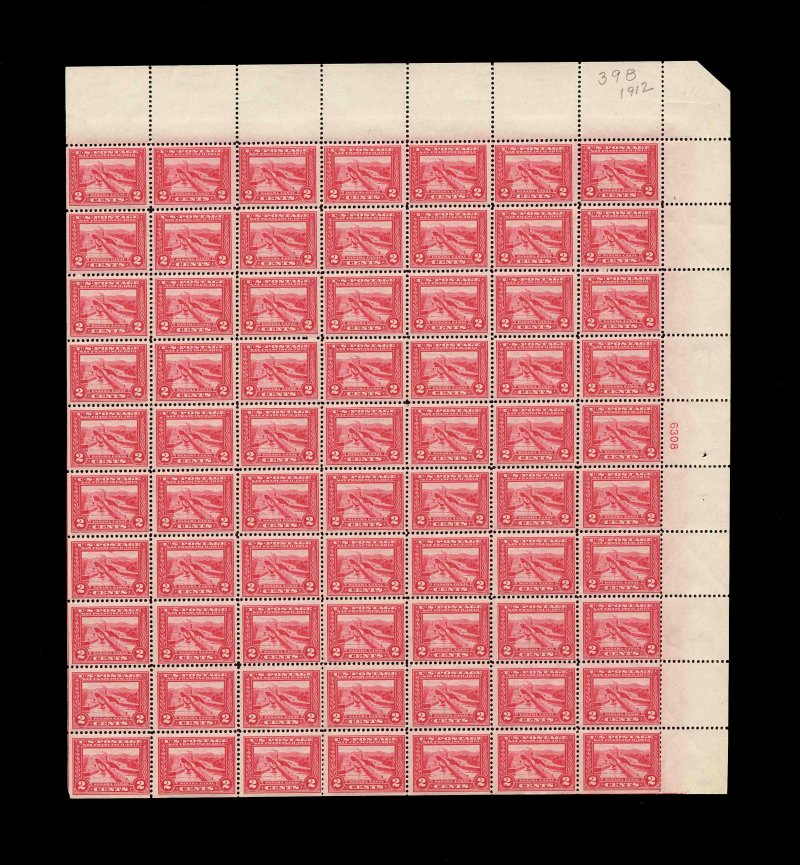 589 nhbl 398 #398, 2c Panama-Pacific, top right plate no. 6308 pane of 70, with plate blocks at top and right (the top plate number is very faintly printed), vibrant color, individual centering ranges from fine to extremely fine gems, o.g., n.h., some minor perf. separation at bottom and left, a very fine pane overall. (Image) 3,220.00+