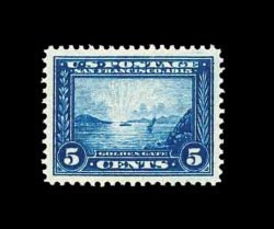 590 nh 399 image#399, 5c Panama-Pacific, gem mint example, with lavishly large and perfectly balanced margins all around, sumptuously rich color and impression, o.g., n.h., extremely fine; an especially handsome stamp. (Image) 150.00