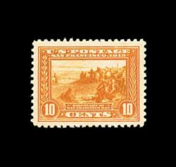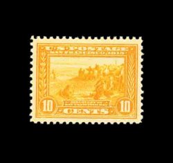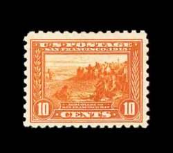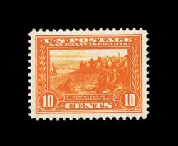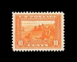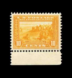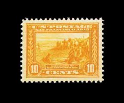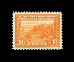 594 nh 400A image#400A, 10c Panama-Pacific, orange, gem mint single, possessing flawless centering amid extraordinarily large margins, gorgeous intense color and impression that is wonderfully contrasted by this stamp's especially bright white paper, pristine o.g. without a single gum bend or skip, n.h., extremely fine; a stamp for the perfectionist; 2002 PF certificate. (Image) 425.00