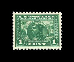 598 nh 401 image#401, 1c Panama-Pacific, perf. 10, outstanding centering amid large margins, lovely rich color and a sharp impression on fresh paper, o.g., n.h., extremely fine; photocopy of a 2001 PF certificate for a pair, this being the left stamp. (Image) 47.50