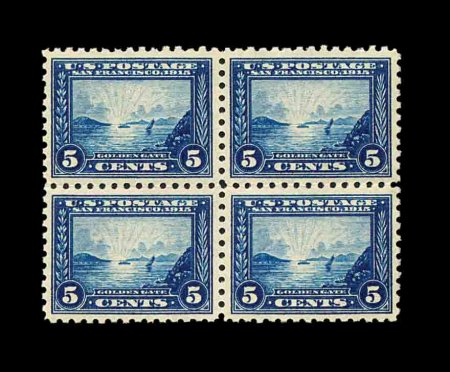 599 og/nhbl 403 image#403, 5c Panama-Pacific, perf. 10, especially handsome and choice mint block of four, with each stamp within the block being unusually well centered and margined for this value, deep luxuriant color, pristine o.g., three stamps n.h., fourth stamp at top right barely hinged (if at all), extremely fine. (Image) as singles 1,150.00+