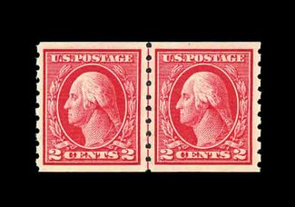 603 nh 413 image#413, 2c Carmine coil, Ty. I, perf. 8 1/2 vert., guide line pair, uncharacteristically well centered within large margins, prooflike color and impression, o.g., n.h., extremely fine; an especially scarce line pair in this gem condition; 2001 PF certificate. (Image) 550.00