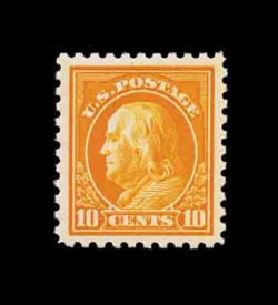 614 nh 433 image#433, 10c Orange yellow, exceedingly well centered within lavishly large margins which are most impressive, gorgeous vivid color and a deeply etched impression on clean white paper, o.g., n.h., extremely fine; a spectacularly choice gem; 2002 PF certificate. (Image) 90.00