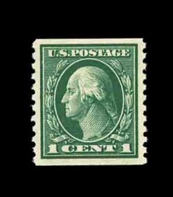 622 nh 443 image#443, 1c Green flat plate coil, perf. 10 vert., gem mint single, precisely centered within unusually large margins, rich vibrant color on clean fresh paper, o.g., n.h., extremely fine; 1997 PF certificate. (Image) 47.50