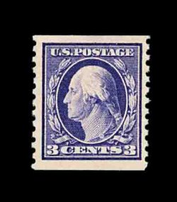 623 nh 445 image#445, 3c Violet flat plate coil, perf. 10 vert., a particularly choice mint single, being exceptionally fresh, with deep intense color and a prooflike impression, plus it is very well centered within the largest margins possible for a genuine coil, o.g., n.h., extremely fine for this; certified select quality singles of this coil are rarely encountered; 1998 PF certificate for a pair, this being the left stamp. (Image) 425.00