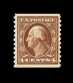 629 O 446 image#446, 4c Brown flat plate coil, perf. 10 vert., rare used guide line pair, outstanding centering within large margins, rich color, light central strike of a double oval pmk., minor flaws, extremely fine appearance. (Image) 900.00