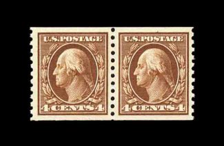 626 nh 446 image#446, 4c Brown flat plate coil, perf. 10 vert., select mint pair, excellent centering amid especially large margins for a coil pair, lovely rich color on fresh paper, o.g., n.h., extremely fine; 1999 PF certificate. (Image) 650.00