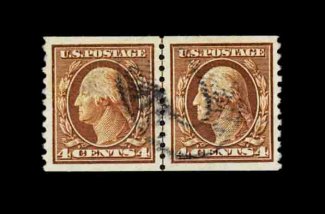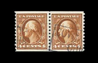 627 O 446 image#446, 4c Brown flat plate coil, perf. 10 vert., highly select used pair, being extraordinarily well centered within large margins, rich luxuriant color and impression, light and neat portions of boxed postmarks, extremely fine; a seldom seen used coil pair, particularly in this premium condition; 2002 PF certificate. (Image) 325.00