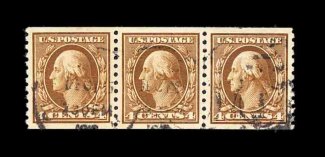 628 O 446 image#446, 4c Brown flat plate coil, perf. 10 vert., fabulously well centered strip of three, used with portions of 1915 duplex town cancels, lovely clear brown color, extremely fine; used multiples of this are far scarcer than the mint, especially in this premium condition; 1996 PF certificate. (Image) 367.50+