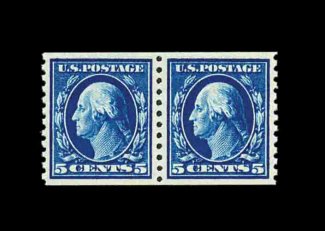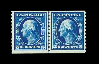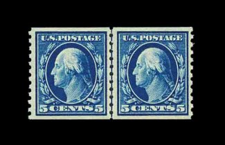 630 nh 447 image#447, 5c Blue flat plate coil, perf. 10 vert., pair, deep luxuriant color on crisp white paper, extraordinarily well centered, o.g., n.h., extremely fine; 1991 PF certificate. (Image) 230.00