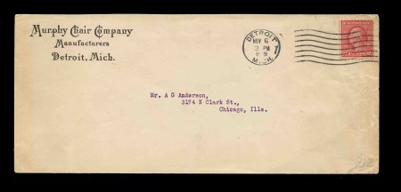 634 c 449 image#449, 2c Red rotary coil, Ty. I, tied to legal size cover with manufactures corner card by "Detroit, Mich./Nov 6/1915" machine postmark, this was formerly the earliest documented usage but an October 29, 1915 usage has now been recorded, which is only a few days earlier than this, small stamp and cover faults, fine; very scarce used on any contemporaneous cover; 1983 AFDCS earliest documented cover report from when this was the EDU and 1983 PF certificate; ex-Fisher. (Image) 1,350.00