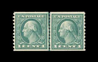 635 nh 452 image#452, 1c Green rotary coil, perf. 10 vert., joint line pair, incredibly well centered, deep luxuriant color and a well incised impression, pristine o.g., n.h., extremely fine; a surprisingly challenging line pair to find in this gem quality, despite its relatively modest catalog value; 2002 PF certificate. (Image) 150.00