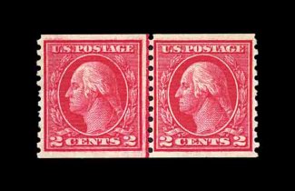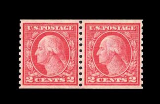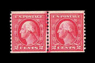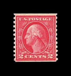 638 nh 453 image#453, 2c Carmine rose rotary coil, Ty. I, perf. 10 vert., highly desirable joint line pair, extraordinarily well centered, intensely rich color and impression, unblemished o.g., n.h., extremely fine; #453 is one of the most difficult of all the Washington-Franklin coils to find as a premium quality line pair; 1987 and 2000 PF certificates. (Image) 1,450.00