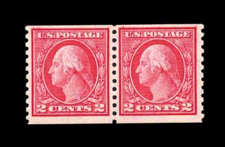 637 nh 453 image#453, 2c Carmine rose rotary coil, Ty. I, perf. 10 vert., select mint pair, well centered within unusually large margins, bright fresh color, immaculate o.g., n.h., extremely fine; 1999 PSE certificate for a line strip of five from which this pair was taken. (Image) 650.00