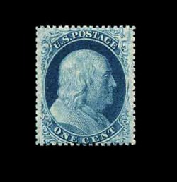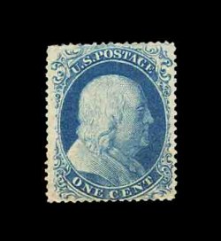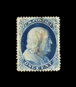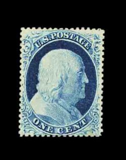 65 og 23 image#23, 1c Blue, Ty. IV, an extraordinarily choice example of one of the most difficult 19th century stamps to find in mint condition, possessing fantastic centering, especially considering that the vast majority of examples are noticeably off center, deep intense color and a razor-sharp impression, full original gum that is only lightly hinged, the accompanying certificate mentions faint toning at bottom right which is practically undetectable and unworthy of mention in our opinion, still an extremely fine example which, in our opinion, ranks among the finest known still retaining their original gum; 2002 PF certificate. (Image) 8,500.00