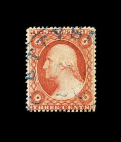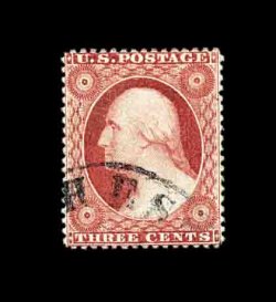 74 O 26a image#26a, 3c Dull red, Ty. IIa, an impressive used example of this terribly difficult stamp to find in premium condition, being extraordinarily well centered amid lavishly large margins which are most uncharacteristic, lovely rich color and impression on bright crisp paper, wonderfully postmarked with a light strike of a blue Gettysberg, Pa. c.d.s., extremely fine; 1997 PF certificate. (Image) 62.50